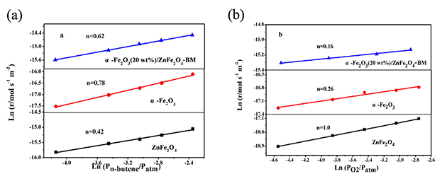 近日,中国科学院兰州化学物理研究所羰基合成与选择氧化国家重点实验室许珊团队对丁烯在铁基α-Fe2O3/ZnFe2O4两相催化剂上的氧化脱氢反应进行了系统研究。通过测定正丁烯和O2在单相和双相催化剂上的反应级数(图1),发现正丁烯在ZnFe2O4上的活化强于α-Fe2O3;而α-Fe2O3对O2的活化能力强于正丁烯。