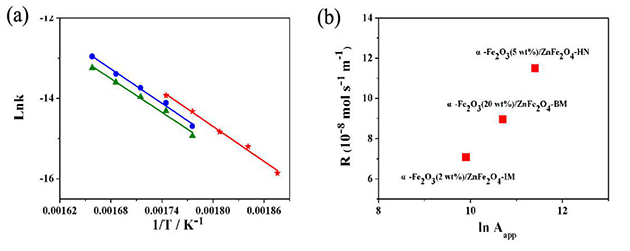 图2. (a)催化剂在n-丁烯氧化脱氢上的Arrhenius图:Fe2O3(5wt%)/ZnFe2O4-BM,蓝色●;Fe2O3(2wt%)/ZnFe2O4-IM,绿色▲;Fe2O3(5wt%)/ZnFe2O4-HN,红色★;