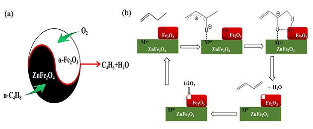 1,3-丁二烯(BD)是重要的石油化工基础原料,也是制备合成橡胶、合成树 脂的重要单体,通过丁烯氧化脱氢制1,3-丁二烯具有良好的经济效益。铁系催化剂是丁烯氧化脱氢最有效的催化剂之一,然而,尖晶石ZnFe2O4和α-Fe2O3在双相催化剂中的作用仍然存在争议。
