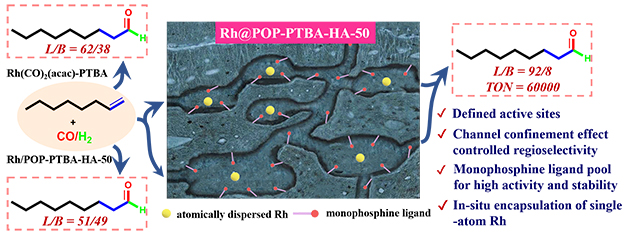 图一、基于单膦多孔聚合物封装单原子Rh催化剂的多相氢甲酰化反应研究