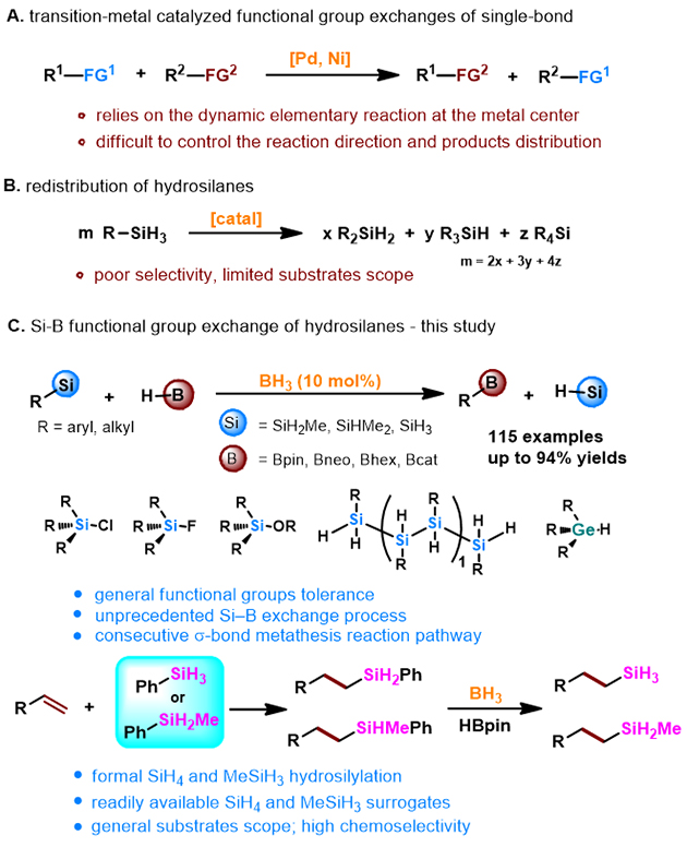 图1.基于单键的官能团交换反应和硼烷催化Si–B官能团交换反应