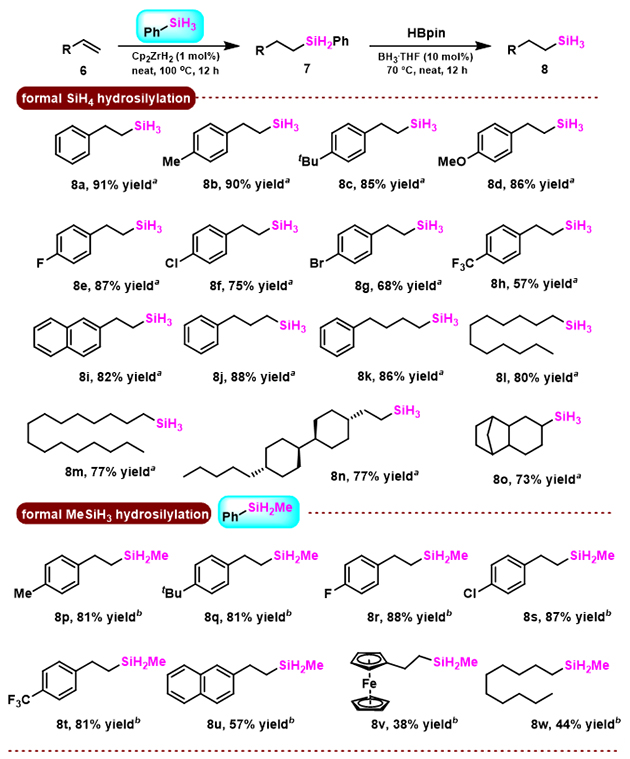 图2.烯烃与SiH4和MeSiH3的形式硅氢化反应