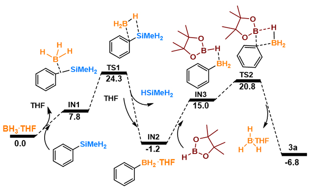 结合相关控制实验、DFT计算和相关文献报道,研究人员提出了该反应的可能机理(图3),PhMeSiH2与BH3·THF接近形成中间体IN1,经过中间过渡态TS1发生C–Si/B–H键的σ复分解反应生成IN2中间体PhBH2·THF,IN2中间体与HBPin结合生成中间体IN3,经过中间过渡态TS2发生C–B/B–H键的σ复分解反应生成最终产物3a,同时BH3·THF再生,完成催化循环。