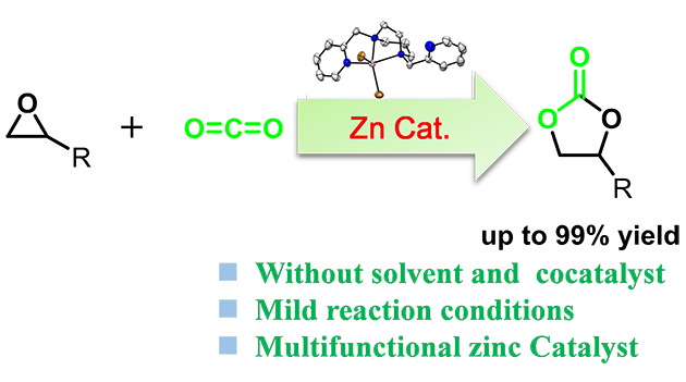 近期,该课题组进一步拓展了非血红素N4金属配合物的应用,开发了N4-Zn配合物作为多功能催化剂,实现了温和条件下催化环氧化物和二氧化碳(CO2)合成环状碳酸酯(图1)。该反应体系具有广泛的底物适用性、无溶剂和助催化剂、多活性位点协调催化、手性底物构型保持、多次循环利用等优点,为CO2利用合成环状碳酸酯,提供了一种新颖的催化体系。