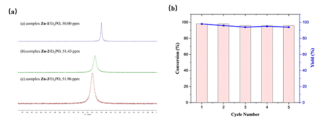 图3 (a)配合物Zn/Et3PO的31P核磁图谱;(b)催化剂循环使用图