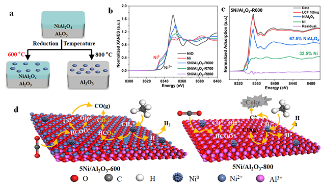 图1.(a) Ni0/NiAl2O4/Al2O3制备示意图; (b) 各还原温度下的催化剂归一化Ni K-edge XANES光谱;(c) 5Ni/Al2O3-R600的线性组合拟合(LCF)结果;(d)催化剂5Ni/Al2O3-600和5Ni/Al2O3-800的DRM反应机理示意图