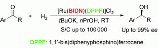 发展实用而高效的手性催化剂用于不对称有机反应是有机合成化学的研究热点之一。通常,刚性的手性配体可在金属中心周围构筑特殊的手性立体微环境,以有效控制反应物分子的空间取向和反应进程,使其发挥特异的对映选择性和活性。目前,用于芳香酮不对称氢化反应的催化剂大多为手性双胺双膦钌配合物,而经济型非手性膦结合手性双胺钌配合物催化剂的报道却为数很少。
