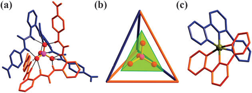 (a)磷酸根络合物的单晶结构(为求清晰略去了非酸性氢原子、溶剂及对阳离子);(b)由两分子受体组装而成的四面体笼的示意图,显示出主客体外形的高度互补性;(c) [Fe(tpy)2]2+. 的单晶结构。
