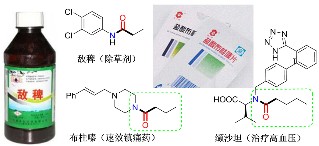 酰胺是一类非常重要的有机化合物,广泛应用于医药、农药、材料和化工相关领域。例如:敌稗(Propanil)为酰胺类高选择性的触杀型除草剂,是防除稗草的特效药;布桂嗪(Bucinnazine),为速效镇痛药,临床上用于偏头痛、三叉神经痛、炎症性及外伤性疼痛等;缬沙坦(Valsartan),为高效治疗高血压药物。因此,酰胺化合物的高效合成一直是有机化学中最为重要的研究领域之一,对生命科学的发展、人类健康和社会文明的进步起着非常重要的作用。