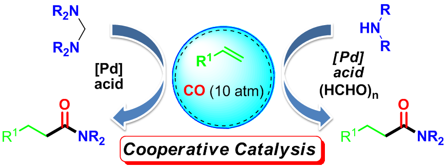 J. Am. Chem. Soc.2012, 134, 20613),利用胺缩醛所具有的弱碱性,以脂肪胺缩醛为氮源通过C-N键活化的方法,设计了钯-催化的烯烃与胺缩醛和水参与的氢胺羰基化反应,在10atm的CO条件下高区域选择性地得到了一系列脂肪酰胺。在此基础上,该课题设计了由Pd/多聚甲醛/酸组成的有机小分子与过渡金属共催化剂体系,实现了各类胺参与的烯烃氢胺羰基化反应,高区域选择性的获得链状酰胺,该催化体系解决了长期以来困扰烯烃氢胺羰基化的科学难题,势必会推动相关领域的发展。该研究成果以