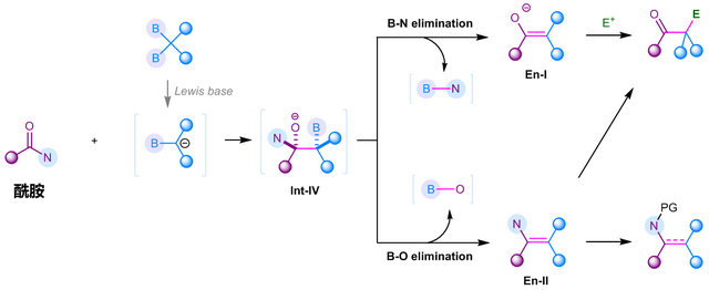 最近,该团队基于前期烷基偕二硼的合成(J. Am. Chem. Soc. 2017, 139, 5257;Org. Chem. Front. 2019, 6, 900;Chin. J. Org. Chem. 2019, 39, 3438)以及转化(Angew. Chem. Int. Ed. 2018, 57, 5501)的研究基础,进一步利用偕二硼实现酰胺的多样性转化。研究发现,一级酰胺、二级酰胺和三级内酰胺经过B-O消除过程得到烯胺中间体;而三级酰胺则经过B-N消除得到烯醇中间体。通过对这些中间体的不同捕获方式,分别合成了α-官能化酮、β-氨基酮、烯酰胺、β-酮酰胺、γ-酮酰胺以及α-烷基化三级环内胺类化合物(图2)。