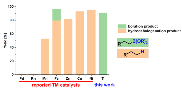 前过渡金属和后过渡金属络合物不同的结构特征使得其通常具有与后过渡金属互补的催化活性。此外,一些前过渡金属在地壳中的含量丰富,如金属钛是地壳中含量第七的金属元素。但是,相对于如钯、铑、铱、铜等后过渡金属,前过渡金属在催化反应中的应用类型相对较少,很有必要拓展新的反应类型及应用。中科院兰州化物所羰基合成与选择氧化国家重点实验室吴立朋课题组自成立以来一直致力于前过渡金属催化的烯烃、烷烃官能团化研究(Angew. Chem., Int. Ed., 2019, 58, 16167-16171; Angew. Chem., Int. Ed., 2020, 59, 13608-13612.)。最近,该课题组和夏春谷研究员课题组合作发展了前过渡金属钛催化的烷基卤代物和硼烷的直接硼化制备烷基硼酸酯类化合物的催化体系。该方法和已知的后过渡金属催化体系相比,可以有效的抑制加氢脱卤副反应的发生(图一)。